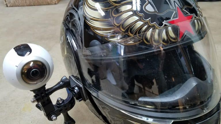 Samsung Gear 360 camera attached to motorcycle helmet w/GoPro mounts